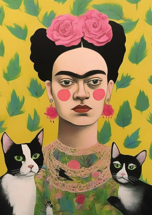 Frida Kahlo with Cats and Yellow Background